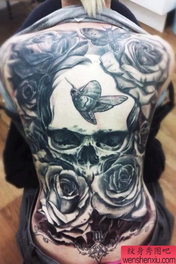 满背玫瑰花骷髅头纹身图案由纹身图吧分享