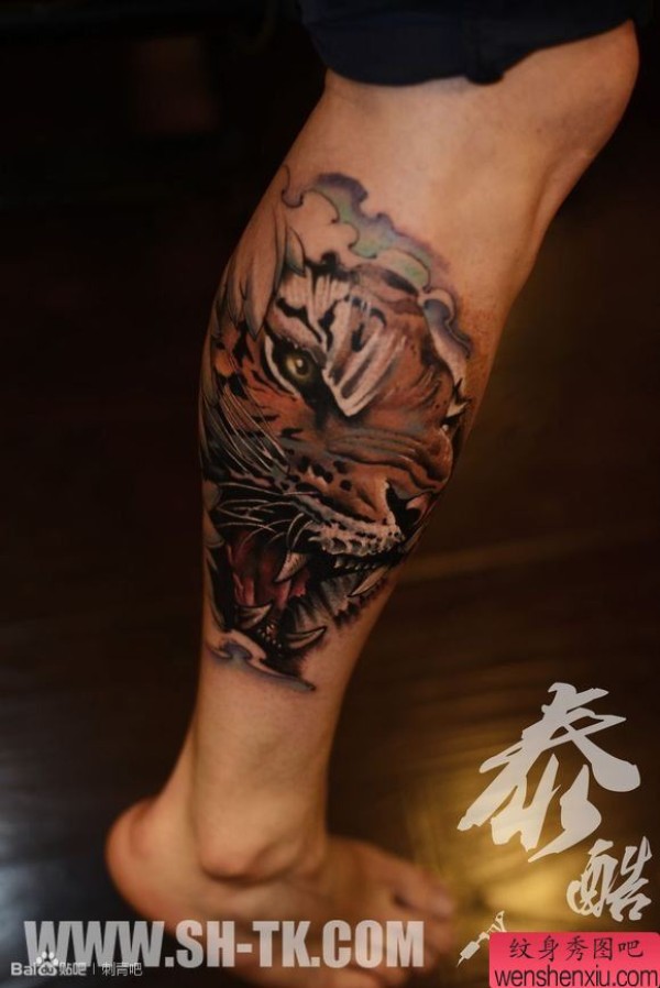 腿部彩色霸气虎头纹身图案