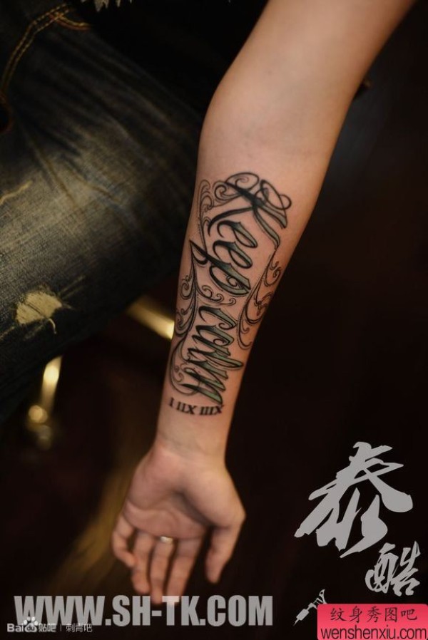 男士手臂重彩英文字纹身图案
