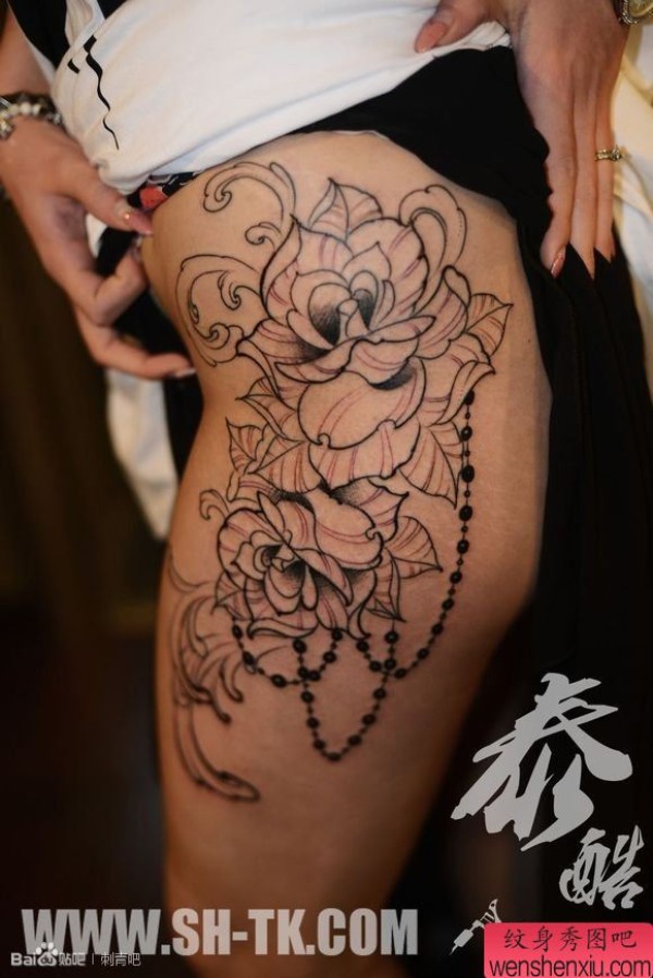 女性一张大腿线条花珠子纹身图案