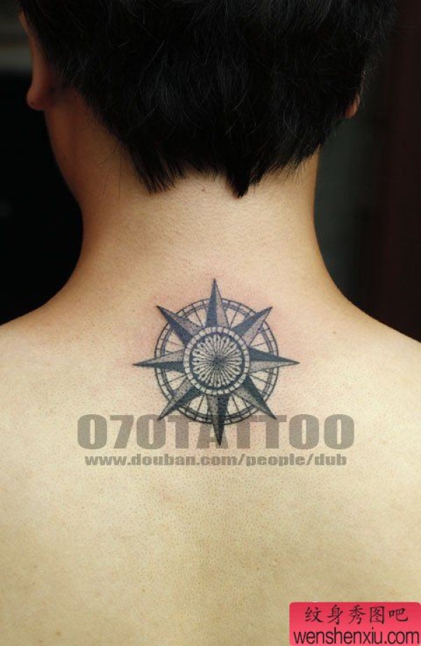 展示颈部上的一张指南针纹身图案