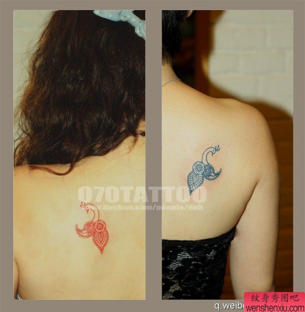 美女后背的一张精致小孔雀纹身图案