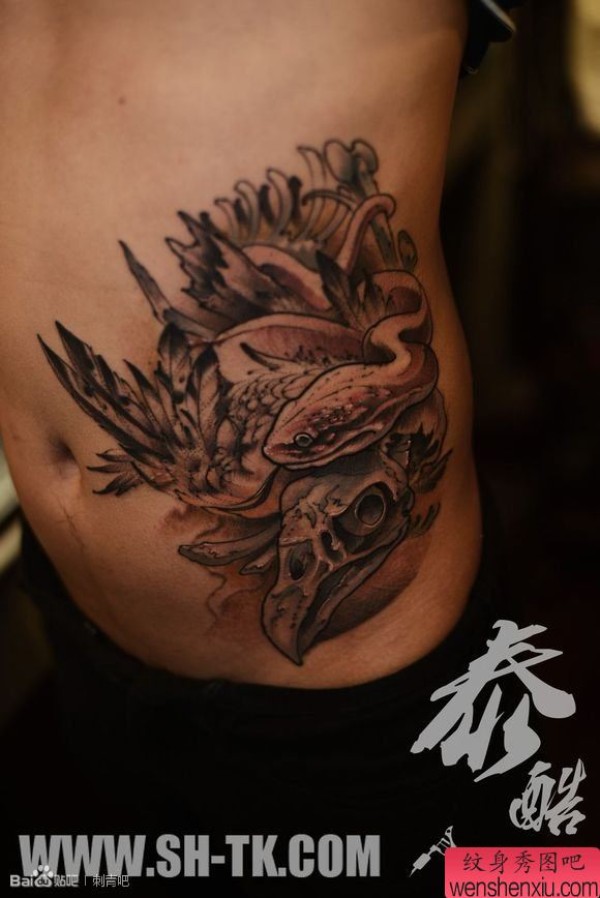 男士腹部蛇鹰之图纹身图案