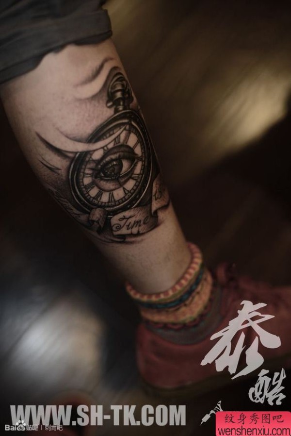 腿部一张时钟之眼纹身图案