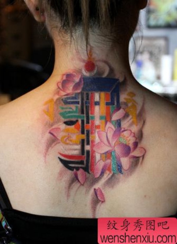 一张背部颈部梵文莲花纹身图案