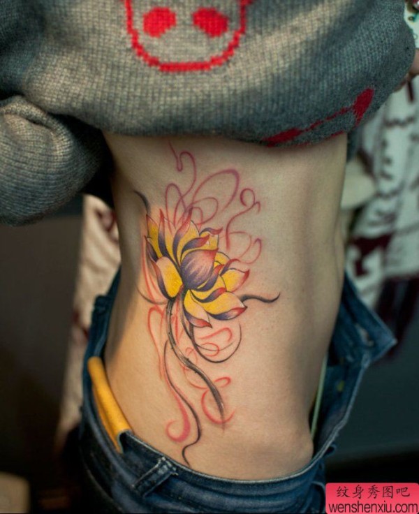 纹身图吧分享一张女性侧腰莲花纹身图案