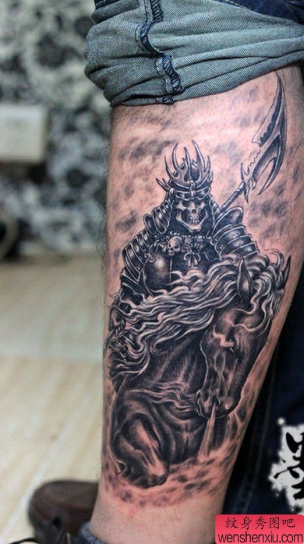 纹身图吧分享一张小腿骷髅马纹身图案