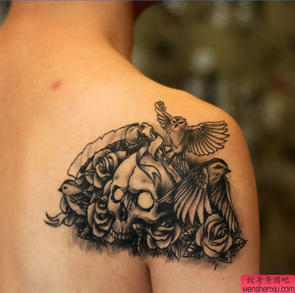 纹身图吧分享一张背部骷髅玫瑰花鸟纹身图案
