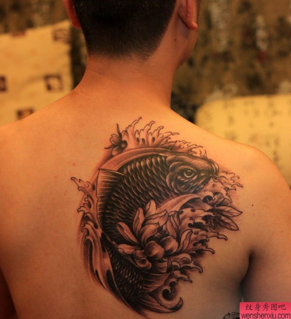 纹身图吧分享一张背部鲤鱼莲花纹身图案