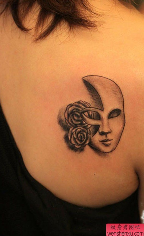 纹身图吧分享一张女性背部玫瑰花面具纹身图案
