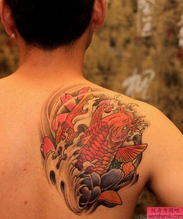 纹身图吧分享一张背部莲花鲤鱼纹身图案
