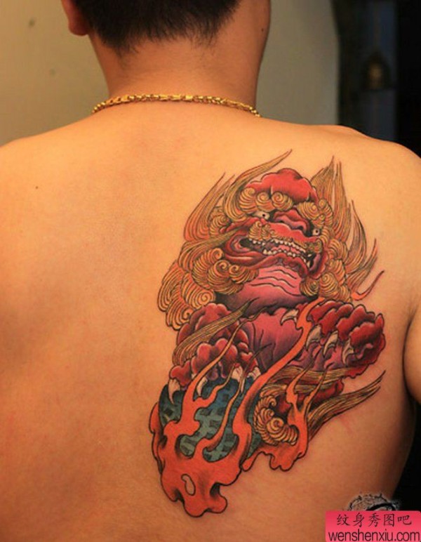 一张彩色背部唐狮子纹身图案