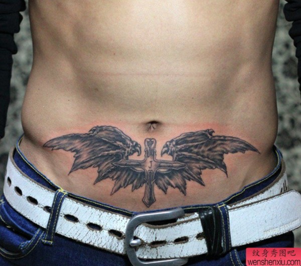 纹身图吧分享一张腹部十字架翅膀纹身图案