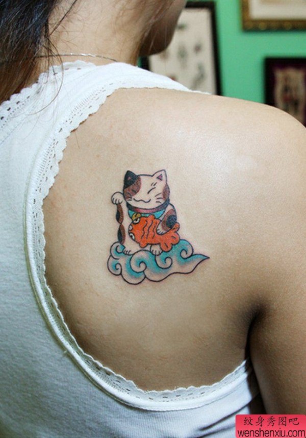 一张背部招财猫纹身图案