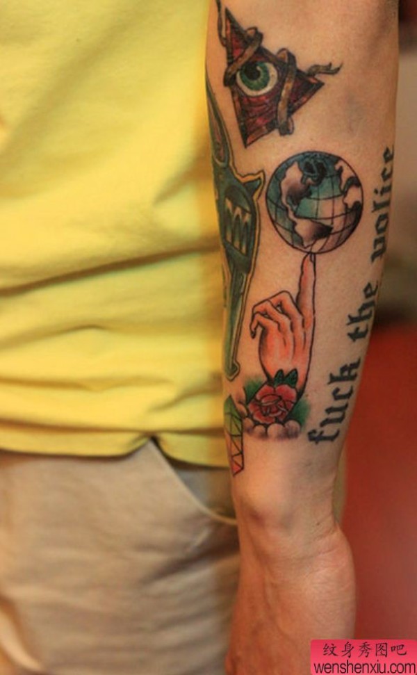 纹身图吧分享一张手臂地球仪纹身图案