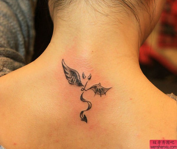 纹身图吧分享一张颈部恶魔天使纹身图案