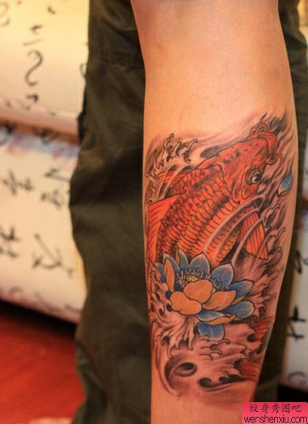 一张小腿鲤鱼莲花纹身图案