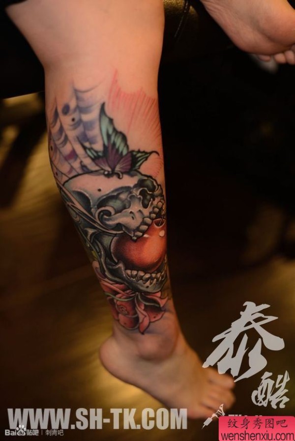 脚部蝴蝶花骷髅(一)纹身图案