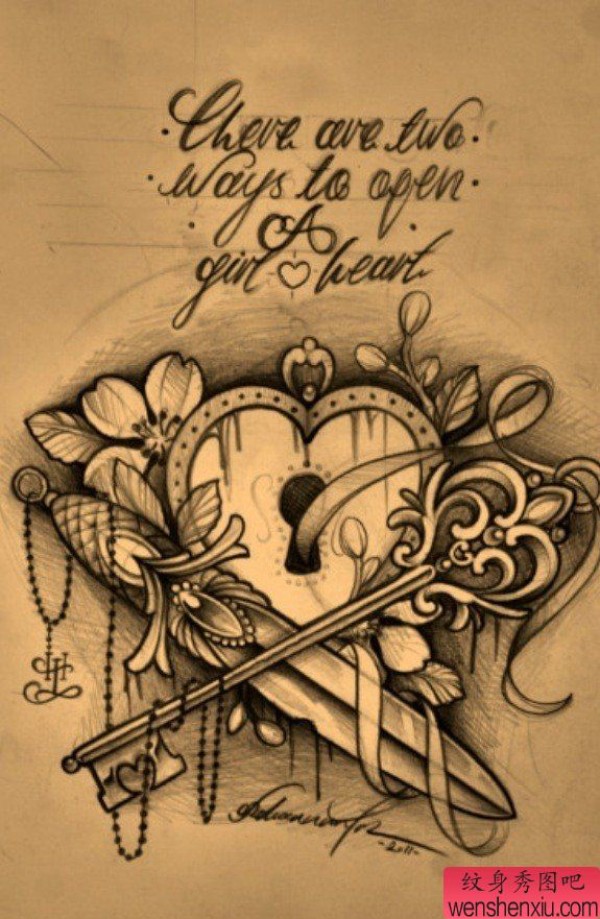纹身图吧分享一张爱心钥匙匕首刺青图案