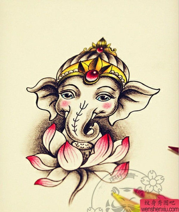 象神莲花纹身手稿图案