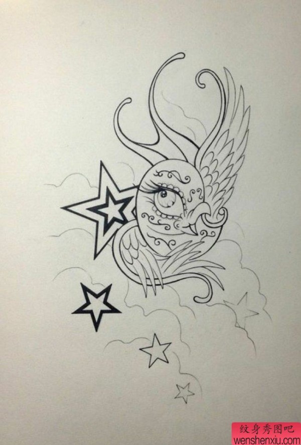纹身图吧分享一张鸟五角星刺青手稿图案