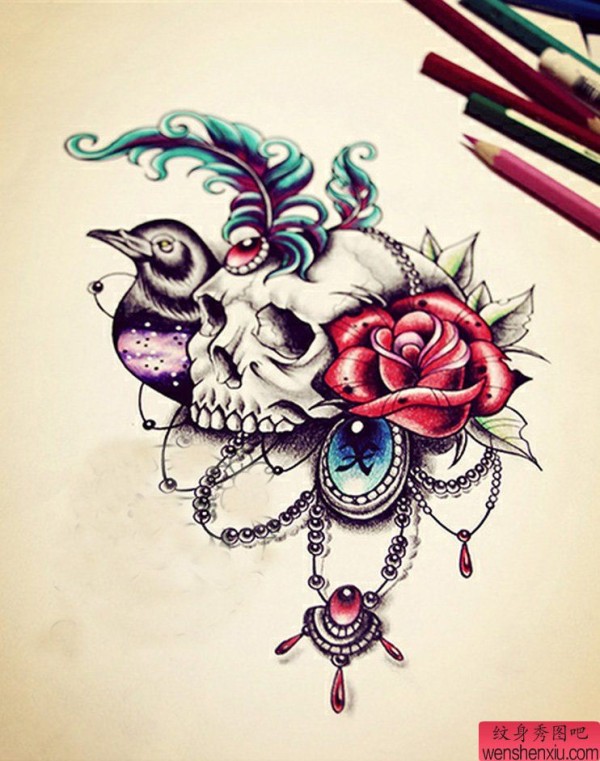 纹身图吧分享一张骷髅羽毛玫瑰花纹身手稿图案