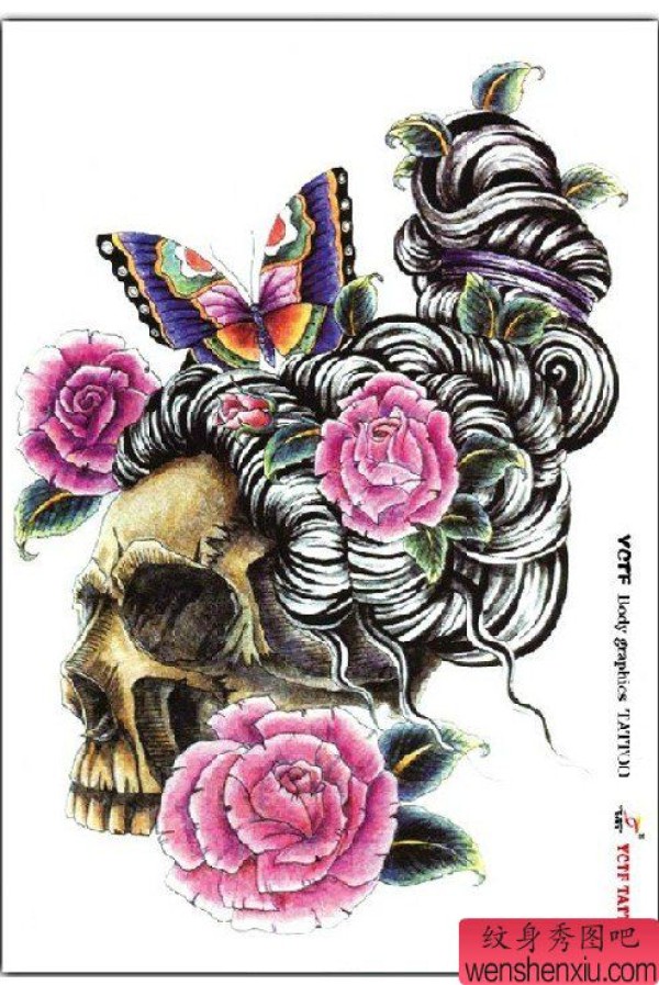 纹身图吧分享一张艺妓骷髅玫瑰纹身手稿图案