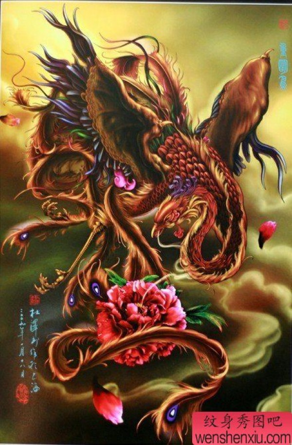 一张非常彩的凤凰刺青手稿图案由纹身图吧分享