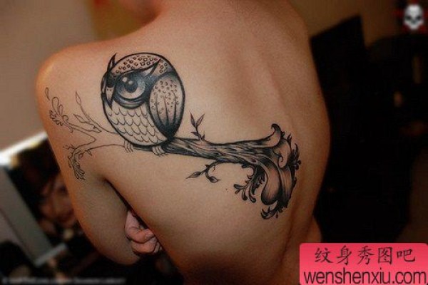 纹身图吧分享一张女性肩部猫头鹰刺青图案