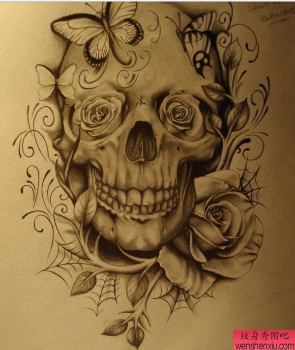 纹身图吧分享一张骷髅头花蝴蝶刺青手稿图案