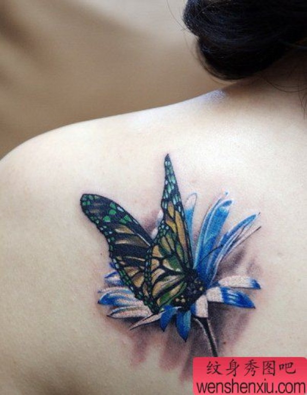 纹身图吧分享一张女性肩部蝴蝶花刺青图案