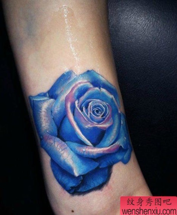 纹身图吧分享一张手臂蓝色玫瑰刺青图案