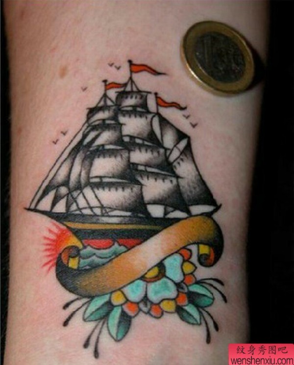 纹身图吧分享一张手臂帆船刺青图案