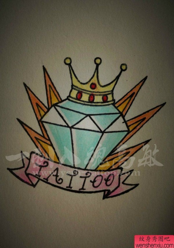 纹身图吧分享一张钻石皇冠飘带刺青图案