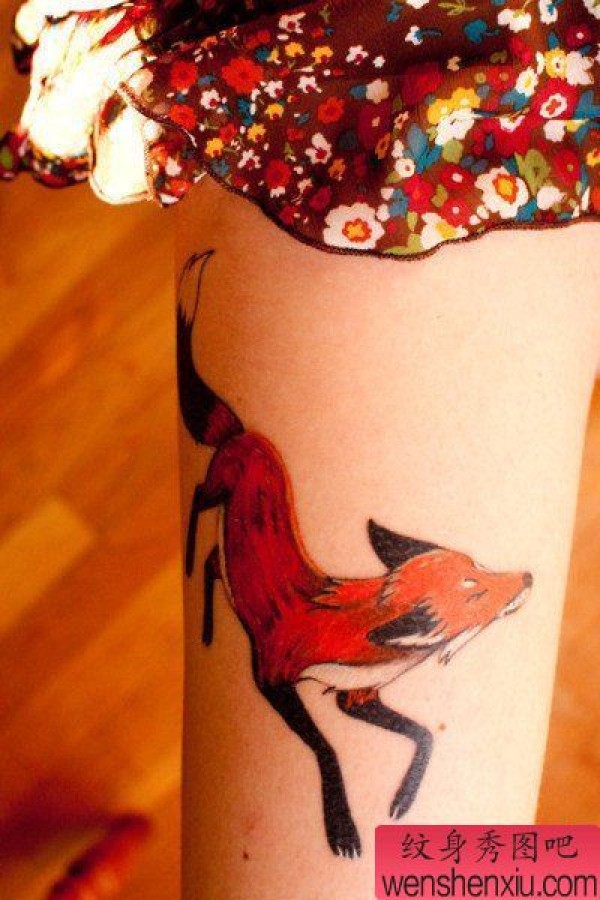 一张女性腿部红色狐狸纹身图案