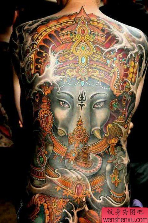 纹身图吧分享一张彩色满背象神纹身图案