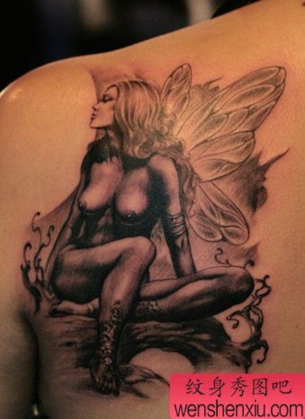 纹身图吧分享一张背部天使纹身图案