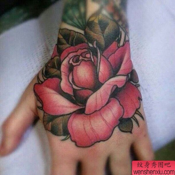 纹身图吧分享一张手部彩色玫瑰花纹身图案