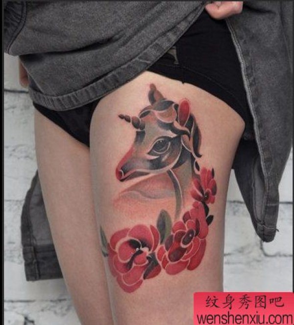 一张腿部独角兽玫瑰花纹身图案
