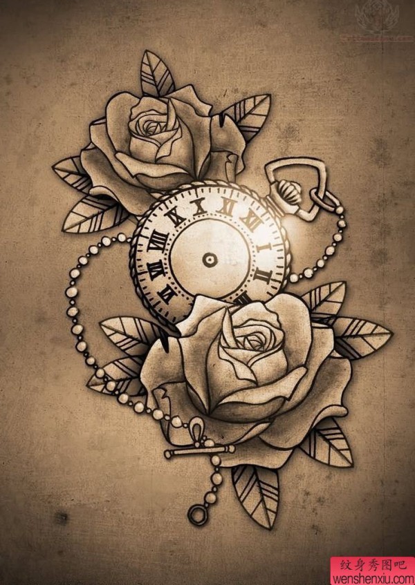 纹身图吧分享一张玫瑰花怀表纹身图案