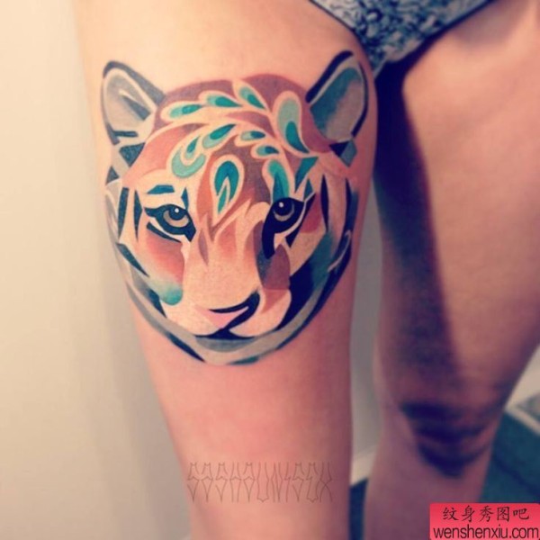 纹身图吧分享一张女性腿部彩色老虎纹身图案