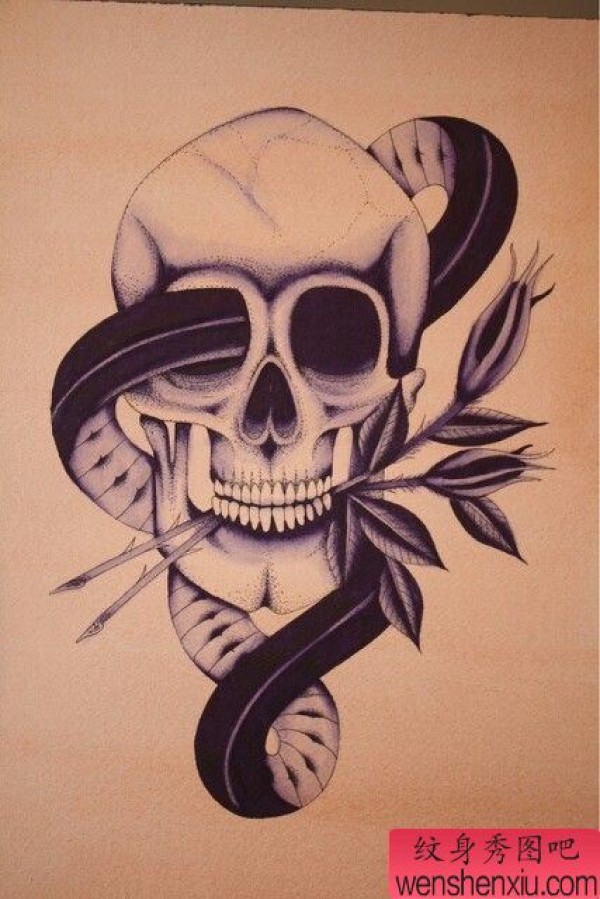 纹身图吧分享一张骷髅头蛇纹身图案
