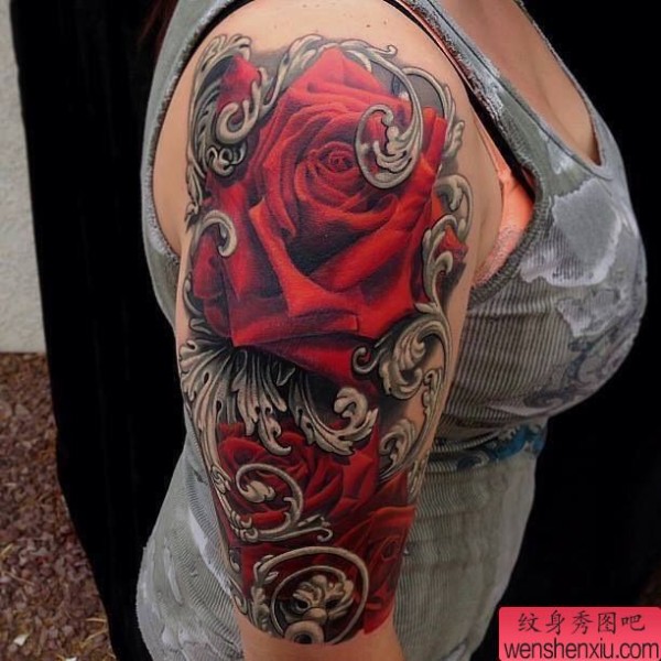 纹身图吧分享一张女性手臂欧美玫瑰花纹身图案