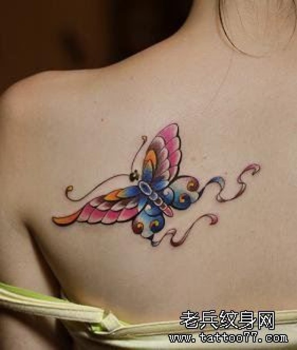 一张女性肩部彩色蝴蝶纹身图案