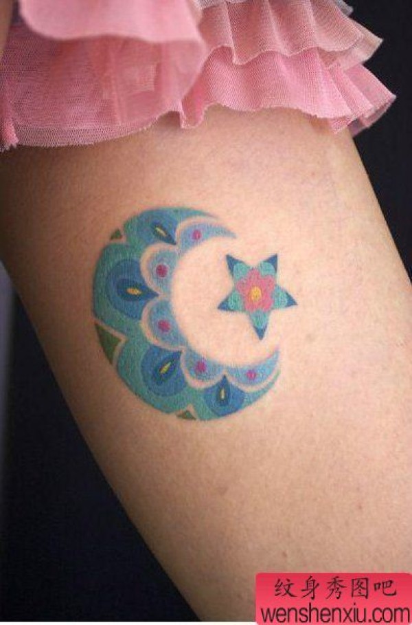 纹身图吧分享一张腿部彩色月亮星星纹身图案