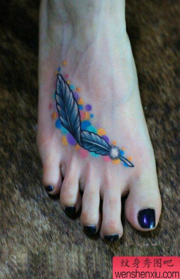 一张脚背彩色羽毛纹身图案