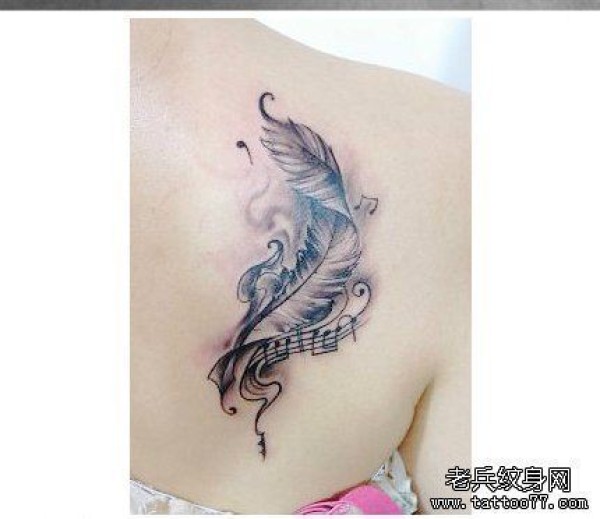 一张女性肩背羽毛纹身图案