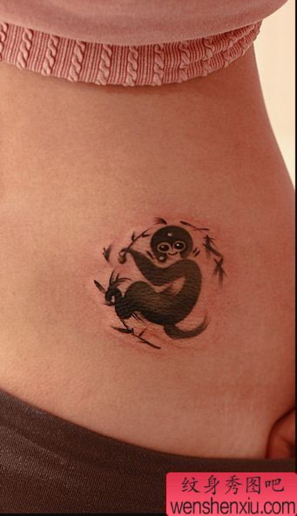 腰部顽皮水墨猴纹身图案