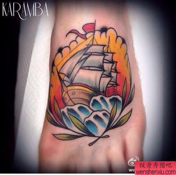 纹身图吧分享一张脚背school风格帆船纹身图案