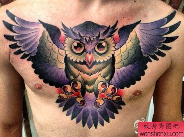 纹身图吧分享一张胸部彩色猫头鹰纹身图案